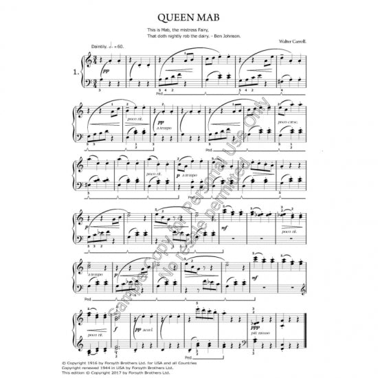 Forest Fantasies was inspired by the reading of Edmund Spencer's poems of elfin lore and is of one of the most famous works by brilliant children's composer Walter Carroll, the Beatrix Potter of learner piano music, whose use of music, poetry and art in his now classic albums have appealed to successive generations of children. As a result they are still widely used on exam syllabi and by teachers around the world nearly a century after they were written. This volume contains nine pieces designed to develop the player's phrasing and pedalling technique. Suggested grade 3