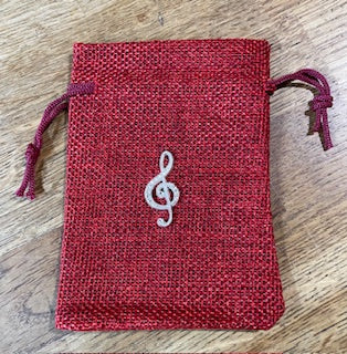 CraftyLu hessian drawstring bag decorated with a treble clef.