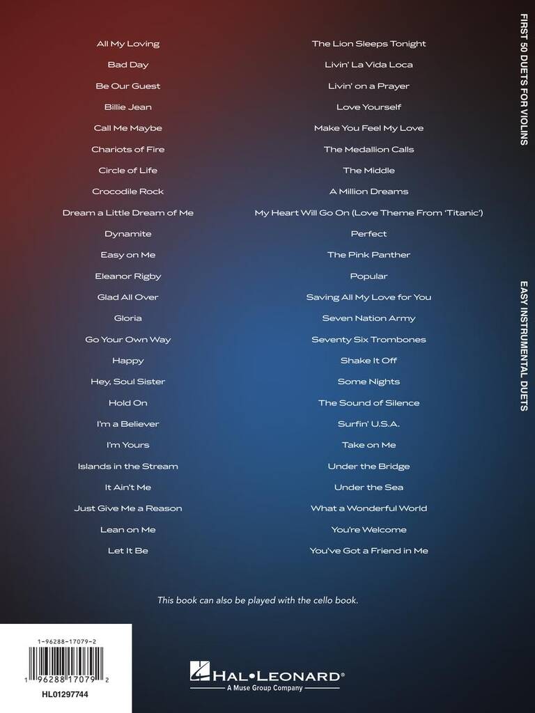 Explore 50 First Duets, the newest addition to the Easy Instrumental Duets series! This collection features easy-to-intermediate arrangements of 50 must-know songs, from Let It Be to Shake It Off, perfect for learning and enjoying music with a partner. Whether playing with two of the same instrument or mixing with other wind instruments, these duets make every practice session more engaging. Songs include: All My Loving · Bad Day · Billie Jean · Chariots of Fire · Easy on Me · Glad All Over · Hey, Soul Sister · Livin' La Vida Loca · A Million Dreams · Popular · Shake It Off · Some Nights · You're Welcome · and more. 1. Circle of Life 2. Hold On 3. Happy 4. Gloria 5. Perfect 6. You'Ve Got A Friend In Me 7. All My Loving 8. My Heart Will Go On (Love Theme From 'Titanic') 9. Lean on Me 10. Livin' La Vida Loca 11. The Middle 12. Bad Day 13. Make You Feel My Love 14. Seven Nation Army 15. The Medallion Calls 16. Popular 17. Billie Jean 18. Shake It Off 19. Chariots of Fire 20. I'M Yours 21. Dynamite 22. Crocodile rock 23. Hey, Soul Sister 24. Dream a little dream of me 25. Eleanor Rigby 26. Some Nights 27. Just Give Me A Reason 28. Call Me Maybe 29. Love yourself 30. Glad All Over 31. You're Welcome 32. Go Your Own Way 33. It Ain't Me 34. A Million Dreams 35. Easy On Me 36. I'm A Believer 37. Islands In The Stream 38. Let it Be 39. The Lion Sleeps Tonight 40. Livin' On a Prayer 41. The Pink Panther 42. Saving all my love for you 43. Seventy Six Trombones 44. The Sound Of Silence 45. Surfin' U.S.A. 46. Sweet Home Alabama 47. Take on me 48. Under The Sea 49. What a Wonderful World 50. Under the Bridge