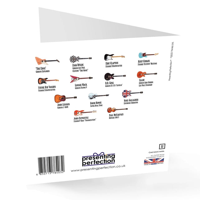 Hand painted Electric Guitars Card, all with famous owners for any Guitar lover, rear of card has lovely pictogram of all the guitars and their owners, to make your recipient smile