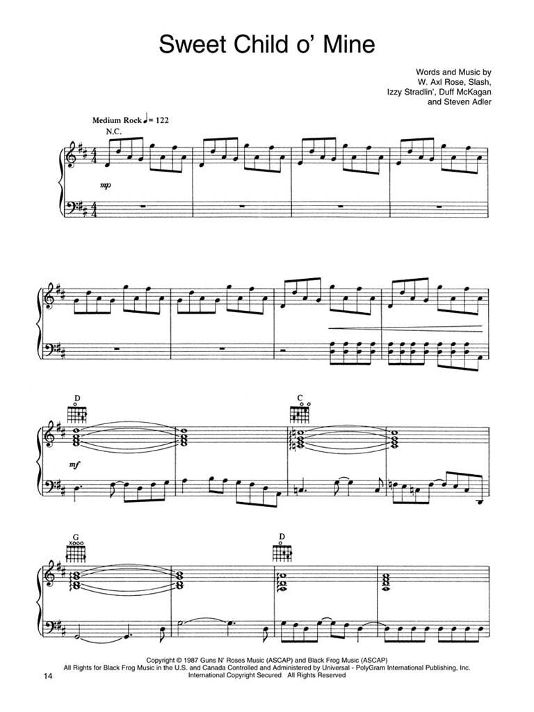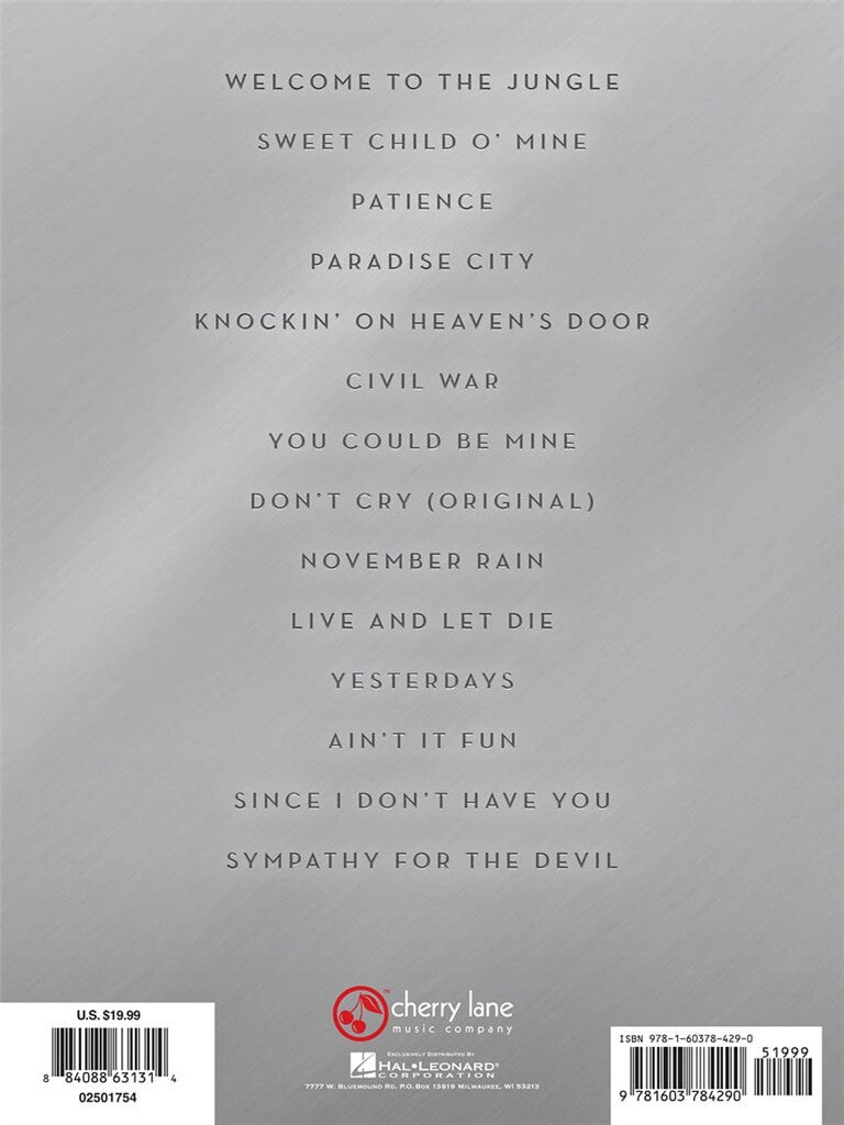 14 rock anthems from the great GN'R, in artist-approved P/V/G arrangements: Civil War · Don't Cry · Knockin' on Heaven's Door · Live and Let Die · November Rain · Paradise City · Patience · Sweet Child O' Mine · Sympathy for the Devil · Welcome to the Jungle · Yesterdays · You Could Be Mine · and more.