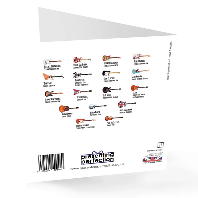 "Real', notable hand painted Guitars, all with famous owners, perfect for any Guitarist Greeting Card, Rear of card has lovely pictogram of all the guitars and their owners, to make your recipient smile.